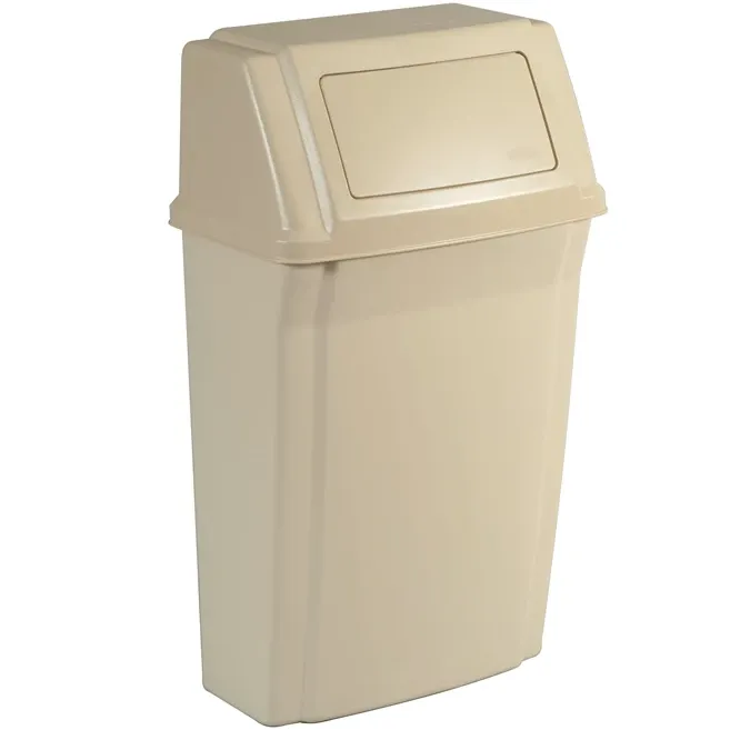 Contenedor de pared Rubbermaid de 15 gl con puerta batiente. Ahorra espacio, fácil limpieza y accesible. Ideal para cocinas, baños y pasillos.